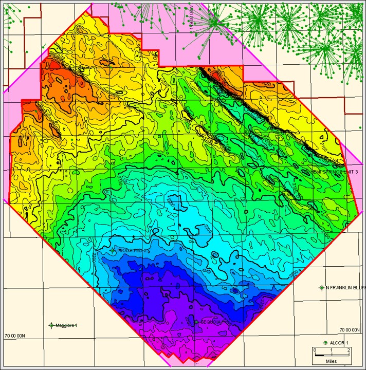 Time-structure map on Top Shublik Fm. (red=shallow, blue=deep)